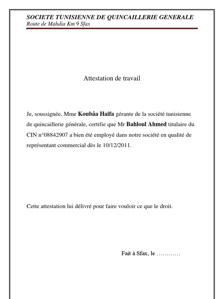 Exemplaire Dattestation De Travail Exemple Attestation De